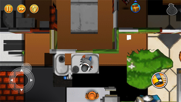 游戏开始之后我们会进入别人家的房间,我们可以控制人物前进,在游戏中闪光的地方就是可以拿到钱的地方,而有宝箱的地方则是钱最多的地方,另外我们点击右下角的跑步会加速我们的移动速度不过不能一直用是有冷却时间的限制的。