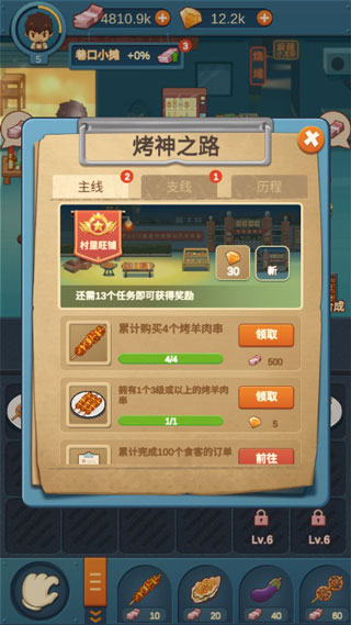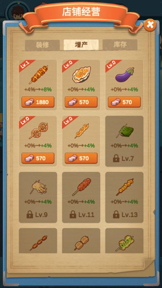 点击【经营】可以装修我们的摊位,提升烤物产率(更快的获得烤物),查看烤物库存