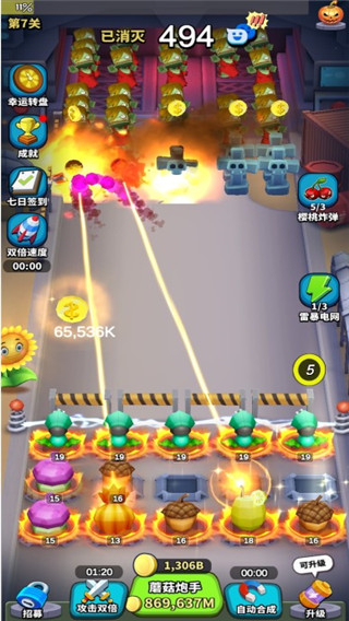 1、首先大家进入到游戏当中,点击中间的炮台购买植物,并且这个炮台是可以看见当时生产的植物的,每升级炮台一起,产出的植物级别也会增长;