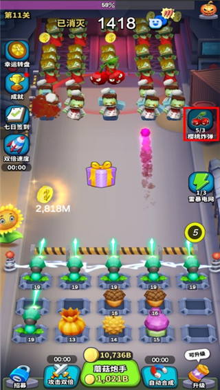 2、在僵尸群体过于庞大时,还可以利用旁边的樱花炸弹,针对自己想要爆炸的位置进行攻击;