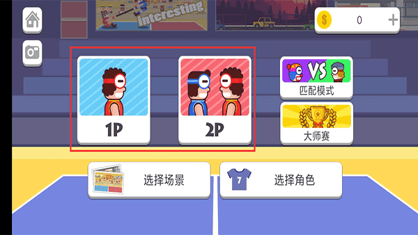 2、可以选择单人还是双人,选择场景和角色,并且可以选择模式,点击“2P”双人模式;
