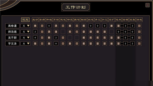 亮着的格子点一下就会变成黑色,黑色意味着这个人不会去干这件事情,同样的,亮着的就意味着这个人会去干这件事,如果你需要一个人去狩猎,那么你点亮狩猎就可以了,因为点数高的人效率更高,那么我们就应该尽量让点数高的人去干你希望干的事情,比如四个人物烹饪分别为7 3 2 0,那么7和3的人物烹饪更快也更容易成功,可是因为7是主人物,经常会出门,所以我让7 3都亮着,让2 0变成黑色。经常干一件事情的人相应的技艺点数会增加,比如你经常采矿,那你的采矿技艺就会一直缓慢增加,所以不要吝啬机会去培养你需要的人才。最前面一栏是优先,就是这个人物会专注于做的事情,一般来说所有人都会默认优先建造,如果你某个人物专注于干一件事情,比如伐木,那么你只需要优先伐木,这样就不会出现他突然跑去加工木板的情况了。