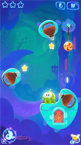 先割断箭头1标示的绳子,获得星星后改变主角形态,利用空气瓶将它吹到泡泡里,沿着其余两颗星星的轨迹飘到空中,到达圆圈位置时戳破泡泡即可。