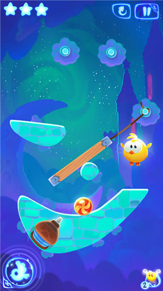 割断糖果的绳子获得第三颗星星后戳破泡泡即可通关。