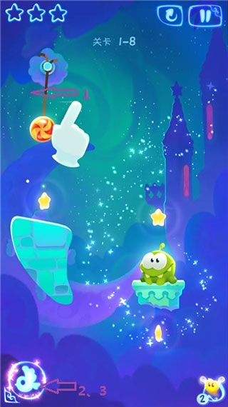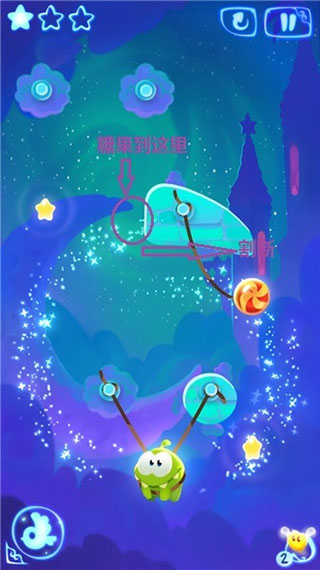 将糖果的泡泡戳破让其成功的进入下方星河,获得星星后再次蒙上泡泡进入上方星河获得第二颗星星。