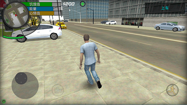 2、左下角按钮移动角色,右侧滑动视角和方向,右下角是疾跑,跑的更快,但是也会消耗更多的能量值(左上角可以看到人物目前的状态);