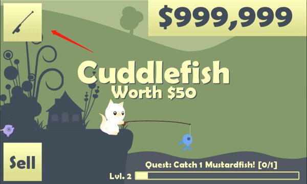7、当等级升级到2级时,点击左上角的鱼竿图标。