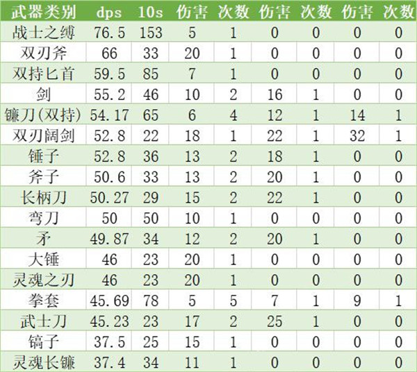 所有类武器在10s蘑菇效果统计如图(dps为蘑菇下的dps)。