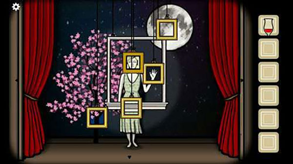 11、第一幕,幕布重新打开零字就出现了一个女人,点击他,让他一直高歌就会出现一个穿着黑色礼服,戴着眼镜的女人,再点击一下,上方就会出现四个盘子,我们把我们刚刚得到的物品放到这些盘子上,顺序是贝壳婴儿心脏和帽子再点击这个女人,他会口吐一束光,嘴里长出一朵花,我们拿到花女人就谢幕了。