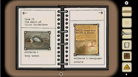 13、点击两次钥匙孔后出现眼睛,观察眼睛上的图案位置,转动时钟的指针至十二点四十五,打开暗格后获得「三角形钥匙」,用钥匙打开右边的抽屉获得「胶片2」和「手帕」,打开左边的抽屉是各种文件夹,里面有书架上摆放书位置的提示和一个「文件」