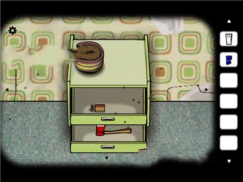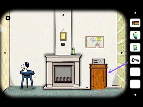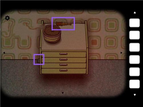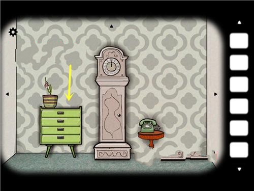 我们依然先是默认的面对有大型钟的这面,在盆栽柜子上拿到望远镜,然后一直点击盆栽,就发现一直手深了出来,又缩了回去,可以拿到第一篇相框碎片。抽屉里面可以取得螺丝刀,火柴,柜子边上还有一片碎片,房间钟的上方也可以取得一片碎片。