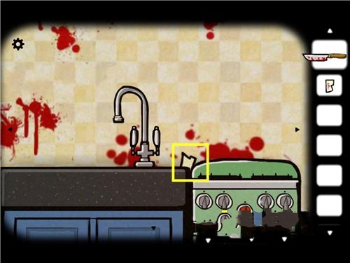 我们这次面对的不再是大钟的那面房间了,这次是厨房,有点恐怖的是,正面墙都是血,玩起来有点瘆的慌。我这时候点近水龙头那块,能发现旁边有一块相片碎片,赶紧的捡起来。仔细搜索一下,发现这里已经没有可探索的了。