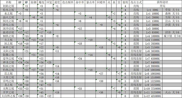 开罗之杖:火山关卡6通过后会赠送,魔攻比龙之杖和骷髅之杖都加得多,走的速度比较快,回复比较慢,回避率没啥用,人物等级低的时候可能一梭子过去就没蓝了,回复又慢,所以不推荐使用,但是开罗之杖免费而且跑得快,后期可以用这个去快速通关。