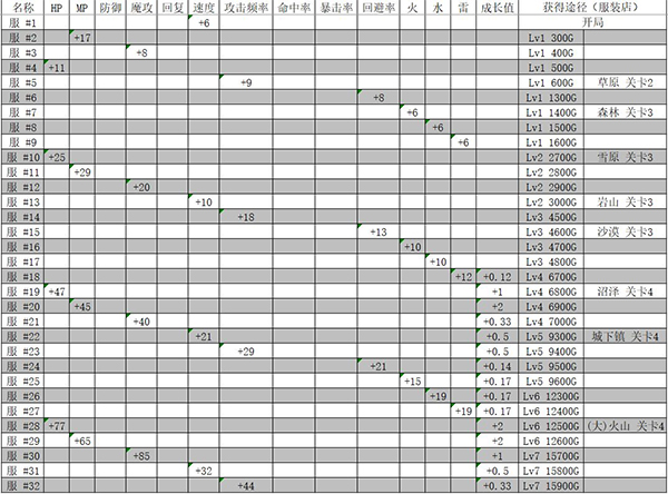 衣服(全都不加防御、回复、命中率、暴击率,只统计部分成长值。推荐选择 服 #30,衣服中魔攻加最多。)