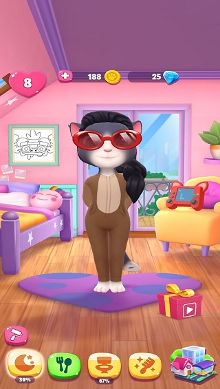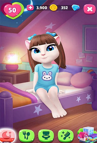 当人物出现打瞌睡的动作时,就代表着它想要睡觉了,这时我们就需要去卧室睡觉,这时我们就可以进入卧室。卧室一共分为了三个区域,分别是:阳台、游戏区、床。玩家只需要用手指轻轻点击一下床,就能够帮助安吉拉来到床的旁边,随后再点一下枕头,就能让安吉拉上床睡觉啦。
