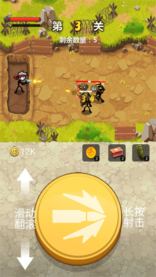 3、进入战斗之后,操作非常的简单,左边是滑动翻滚,长按黄色按钮进行射击;