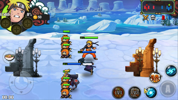 英雄等级上限6级 小兵等级上限3级,英雄的2个奥义技能分别在2级,4级时开启(当局战斗内)奥义技能释放需要承受伤害来获取 查克拉(简称:怒气值)战斗界面中,还有回血技能(回血技能无蓝消耗,但是会消耗当局战斗内金币)
