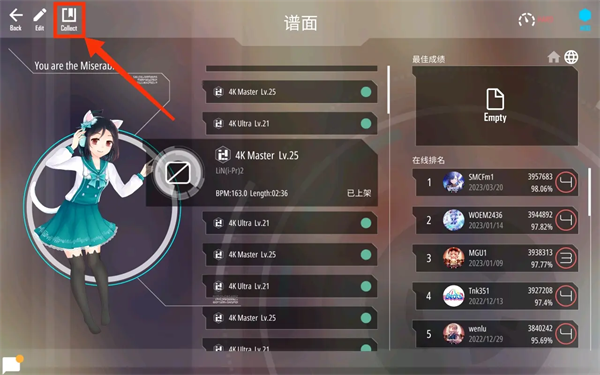 7、下面是打歌界面,中间是谱面的选择,右边是排行榜以及玩家的最佳成绩