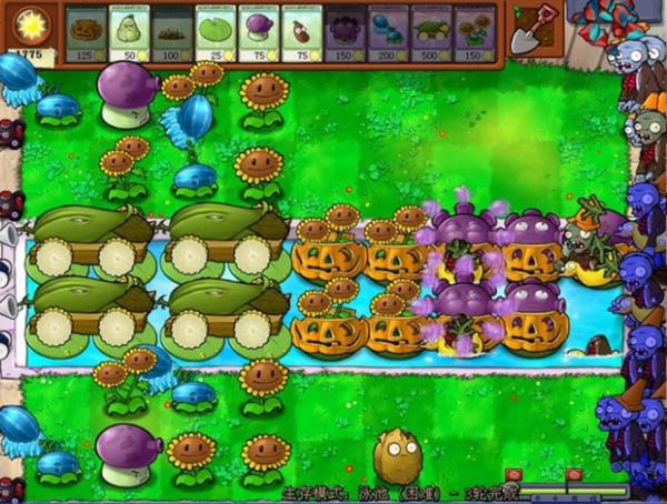 最可怕的僵尸是炸弹僵尸,当炸弹僵尸的音乐出现时,别犹豫,就是一个炸,可以适当选用炸弹,还有,炸弹僵尸出现时,可以选寒冰菇,缺点是费钱,以防万一,炸弹僵尸上阵时要选上睡莲、大喷菇、咖啡豆,以便随时补上战斗力,如果阵容完整,巨型僵尸和冰车顶多走四个格子,所以没什么可怕的,注意后路不要被矿工僵尸吃掉,随时罩南瓜罩(如下图所示):