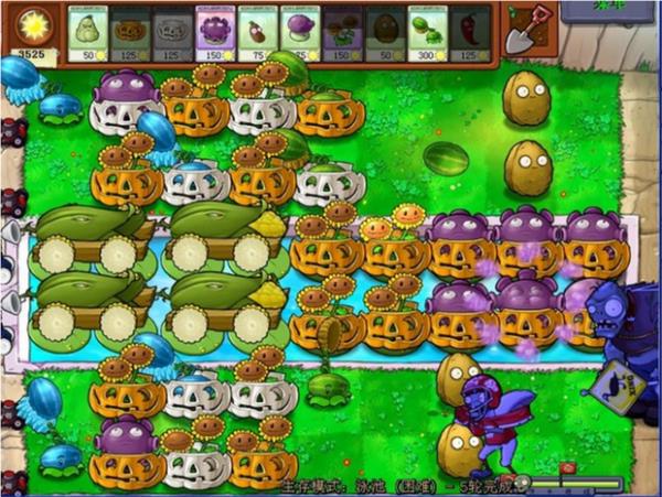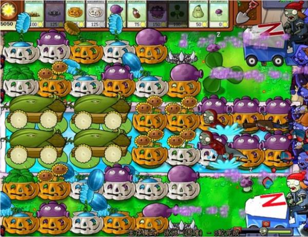 然后,过几关会出现扔小崽子的大僵尸,所以,给倒数地2、3排首先套上南瓜罩,也就是从巨型僵尸来临之际,每关都要选上南瓜罩复制者,扔出的小崽子就交给后排的忧郁菇防守,这时候还是要节约阳光,所以不能选炸弹,选倭瓜就ok,其实要相信西瓜们的战斗力(如下图所示):