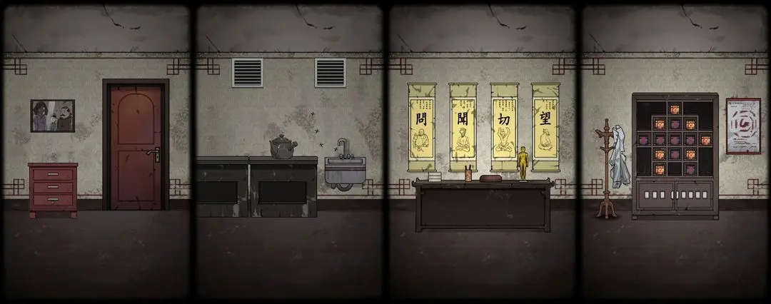 这里要说一下中医室木柜的解密,首先它和数独没有关系,也就是说一旦你用某种方法(例如相加或者相乘)得出数字,那你就被套路了。真正的解法是木框上刻的划痕代表了它所在的一列或者一行会有几个黄色面朝外的盒子。具体步骤如下: