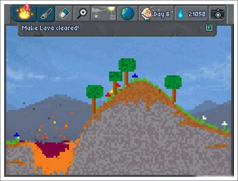 用橡皮在山上挖一个坑,坑里放上油(oil),再用火点燃,得到岩浆(lava),本关完成。