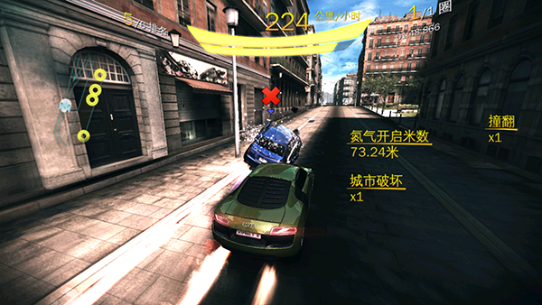 玩家可以抵御跑车的撞击,但是却无法抵御来往车辆的撞击。撞毁敌人固然可以获得更多氮气,但是倘若失败了,玩家将浪费氮气且减速,所以每一次撞击都要注意是否会造成不必要的损失。