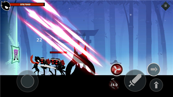 5、点击“攻击”,以断头台,通过按屏幕的左侧,在空中跳跃控制火柴人