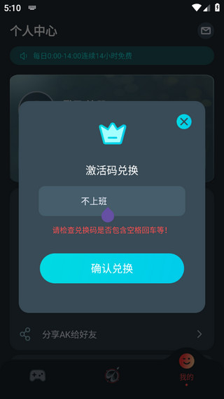 下载并打开AK加速器,点击右上角【设置】按钮,在【激活码兑换】里输入:不上班,即可免费获得48小时超值时长。