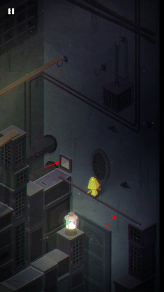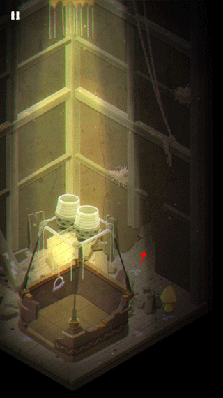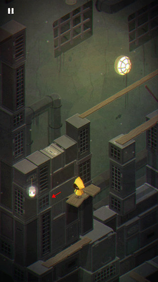 1、游戏的开始就是摩诺用门抵挡外面的攻击,第一关,摩诺在一个类似篮子的地方,需要按住上面的拉杆让自己落到地面上。