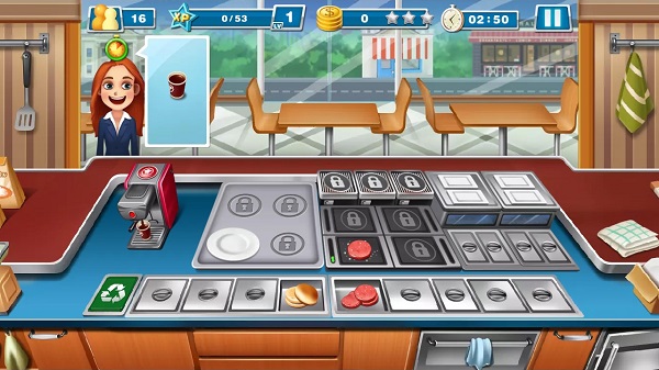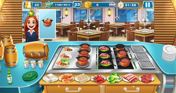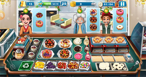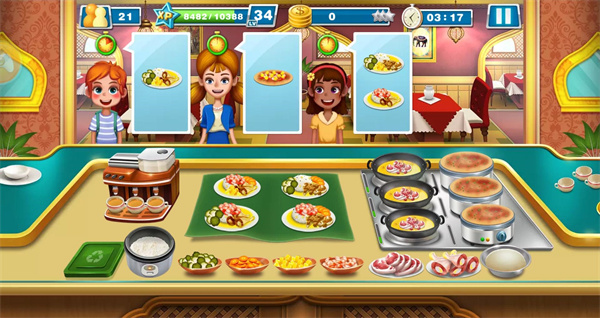 3、进入营业后,你的客人会源源不断的前来消费,此时你需要根据顾客的点餐需要来制作对应的食物,而这里的制作方式是分开进行的,也就是说,配料的搭配显得尤为重要,每一样顺序就更加重要了,若搭配失败怎么办?只能将制作好的食物丢掉了,而这将影响顾客的耐心,并有损时间,限定时间内完不成目标,将得不到三星评价,也就意味着玩家要升级的速率变低。