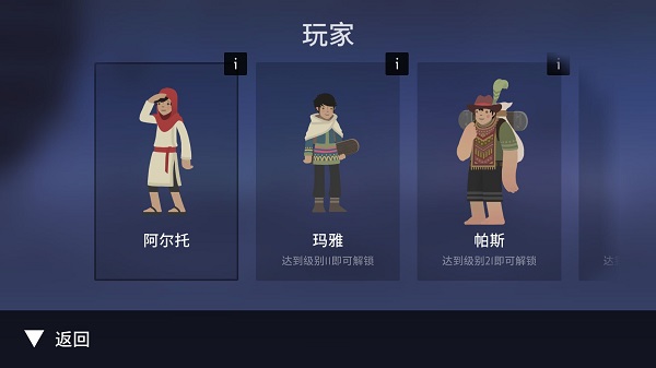 为了这么多实用的道具,大家可要卯足劲去赚取金币了。在主界面的左下方有“玩家”按钮,只有阿尔托是一开始就有的其他玩家都需要解锁。