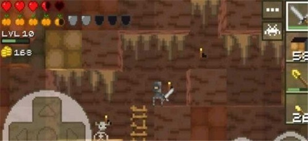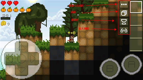 屏幕左下角是控制移动的虚拟摇杆,进行移动,向前探险,右下角的A是跳跃,两次就是两段跳。B是攻击键。途中会通过跳跃、潜水、挖掘来保护自己。