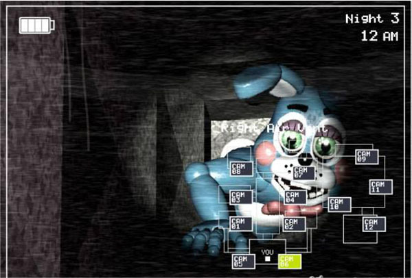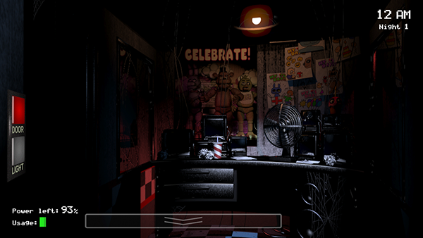 1、第一夜主要是教导玩家一些玩具熊的新的玩法,虽然是教学关卡但是对于刚进入这个游戏的玩家来讲还是有一定的难度。时间还是从12点开始,一开始玩家主要要做的就是查看左右房间的门,在这一关中间的门基本上是不用顾及的,这一关怪的主要来源还是从左右两侧的门进来 1