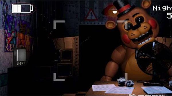 3、注意两点:一是玩家长时间不动的话,会有玩具熊出现直接吃掉玩家,二是一直只关门不开灯照外面的走廊的话,也会有熊出现吃掉玩家。(这一关除了熊的喘息声外多了脚步声,玩家要及时判断声音的来源,然后去关门不让熊出现在屋内。)