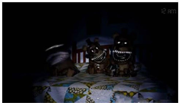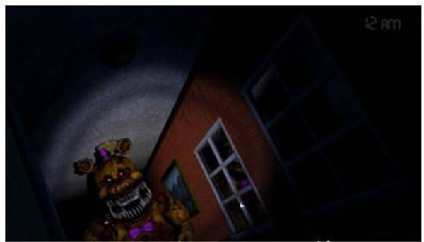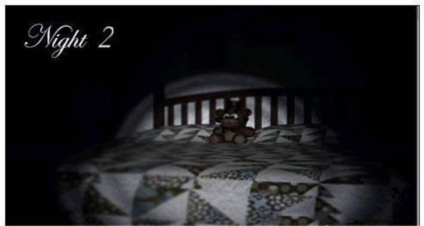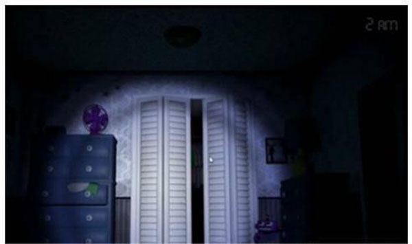 3、2点左右会出现熊的笑声,要及时去查看前面和后面,在柜子就关门,后面就开灯驱散,之后就按照这样的循环继续做:按照脚步声判断熊来的方向,听到笑声检查前后。(这一关跟前面不同的是,玩家长时间不开灯去照射走廊也不会有别的熊来吃玩家,所以听到声音就去关门不用开灯这样可以节约一些时间)