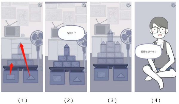 随后城堡会变成(图3)的样子,此时手机向左侧倾斜会看到爸爸的样子并出现对话(看爸爸想干嘛?继续砌吧。)(图4)
