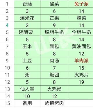 这样靠加血值能得到下面的食物奖励选择,撞一次吃一行,其中最后一列的食物可上下替换或者其他高加血食物替换,1、2列食物可找相同加血食物替换,下图只用到2个派,且行与行没有固定食用方式,先吃哪行都可以,有时会第一行吃的时候加上爆米花,第二行爆米花换成青豆,就又多加一种食物。很灵活