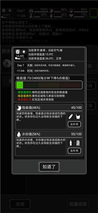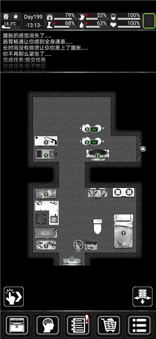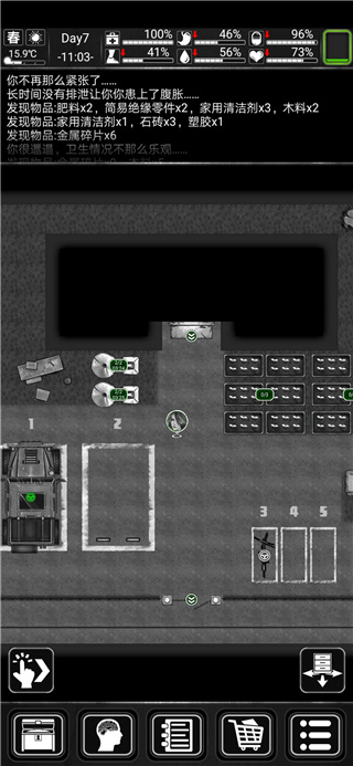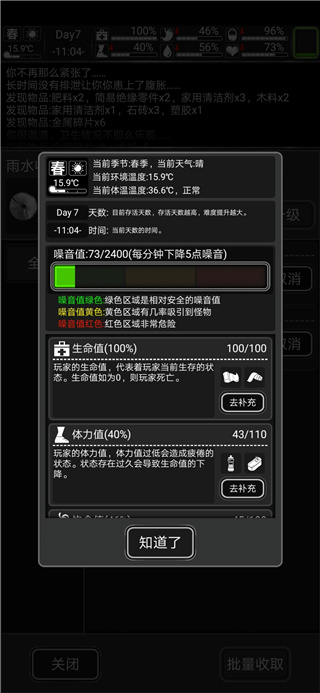 状态栏:记录你的身体状态、温度变化、发现的道具、战斗结果及人物的动作。六维过低时会有不同的提示。