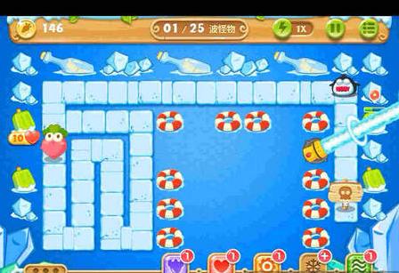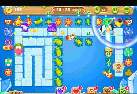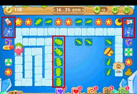2、选择升级的炮塔是很关键的,玩家在游戏的前期需要升级的有火箭炮和冰锥塔来保证小怪不会侵犯到萝卜,同时为清除屏幕上的道具提供了保障。与此同时也要对中间的瓶子炮进行升级,才能有足够的火力去消除怪物;