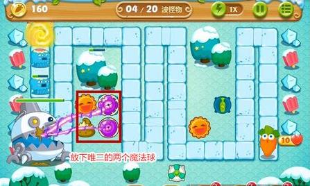 2、铁皮出现后,第一时间用刚才清除道具和小怪的钱,速度放下关卡中唯二的两个魔法球塔(关卡任务,不能建造超过2个魔法球塔)并把两个魔法球攀升到最高等级。