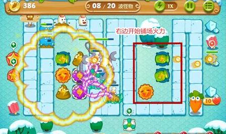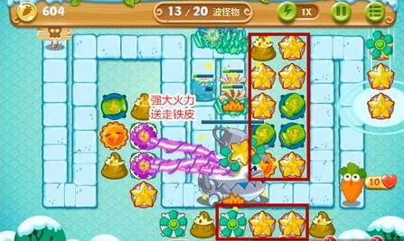 3、铁皮的前进似乎不可阻挡,在铁皮走到,开始在右边的空地布置火力。瓶子炮、炸弹星各2~3个。左边可以放便便塔来延缓铁皮行动,为后场争取时间。