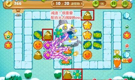 4、等右半场火力布置差不多的时候,铁皮也走进右半场的攻击范围,这是整个战斗的关键,玩家要让铁皮在这段路走的时间越长则越好,此时减速就变得很重要。减速风扇、便便炮塔,玩家快要在图中方框的地方放上,可以保证铁皮一直处于减速状态!
