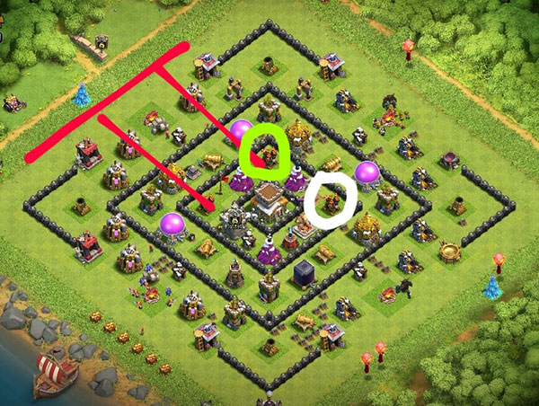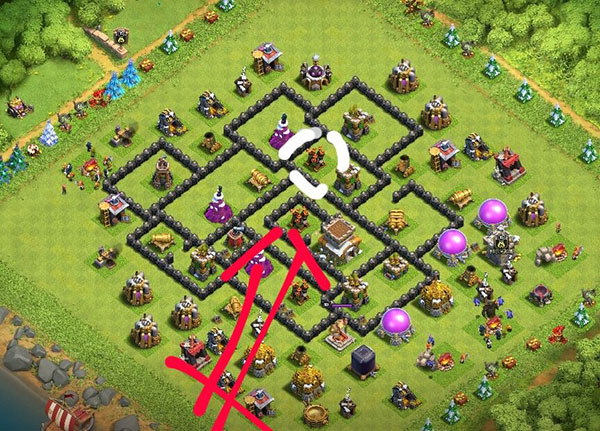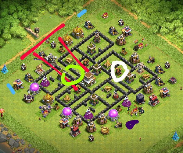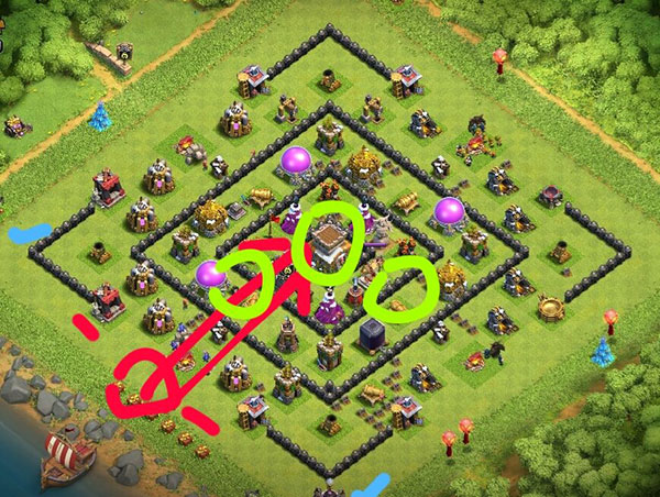 劈得稍微偏一点再加一瓶地震可以带走防空旁边的箭塔或者法师塔,为了防止大部队走偏,下主力部队前一定要清边(部落清边很重要!)事先可以在蓝线处的钻井和金矿处各点一条飞龙等钻井和金矿被摧毁后再下大部队