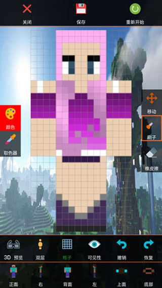 1、创建皮肤:除了默认的3款皮肤外,你还可以通过相册或文件等方式引入别的皮肤进来。2、编辑皮肤:本应用提供了强大的工具供您使用,包括铅笔、色轮、色盘、橡皮擦、放大和缩小工具、移动工具等等,