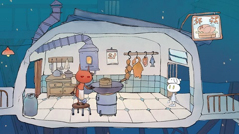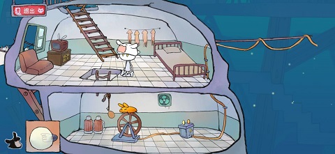 进去后有个在煮饭的人,开始能进(后来好像是不让你进去,你要随便拖东西到锅那几次,搞出水雾就可以了)捡鸡腿,然后向右下去拿气球,就是下面好像是第二个气球,你会发现有绳子加气球了,回去那个煮饭的房间,向左走,把气球拖到水管那,气球就会飞起来(气球装水会飞?)那个胖子会站起来,留下灯泡。搞到灯泡,顺着他坐的那个地方下去,把绳子拖到破楼梯上,把鸡腿绑上,兔子就开始发电了。去拿气球的那个地方,把灯泡放下,去量身高