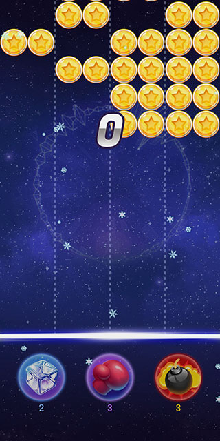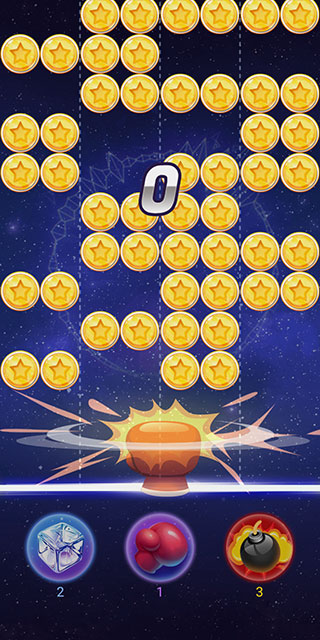 2、我们点击其中一个区域,会向上面发射两个并列的球球,当发射的球球与掉下来的球球可以完美填满一排的时候,就会消除并得分。