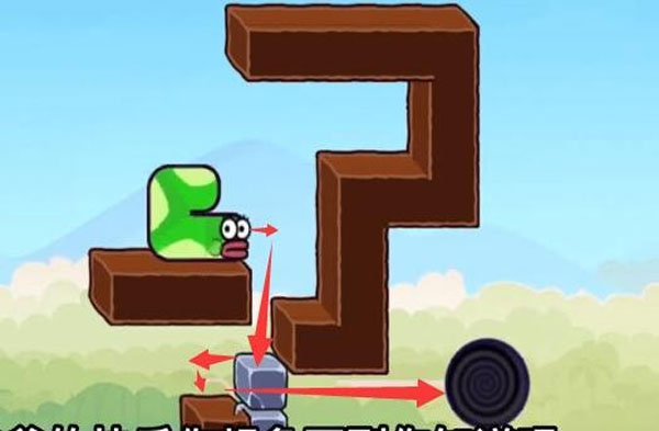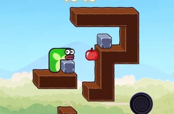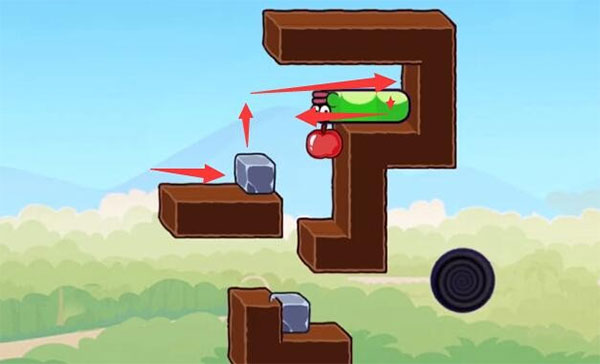 1、如图,移动贪吃蛇,借助左侧的石头和苹果将右侧的石头推下去,然后吃掉苹果