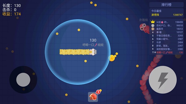 从局内操作层面上,贪吃蛇进化论一方面,玩家可通过摇杆控制贪吃蛇走位,吃到的金币越多,体型越大、长度越长;另一方面,右侧加速键则可让贪吃蛇获得短暂的移动加速效果。场景内还增添了2倍金币符、吸铁石等随机道具,试图加快前期的对战节奏。
