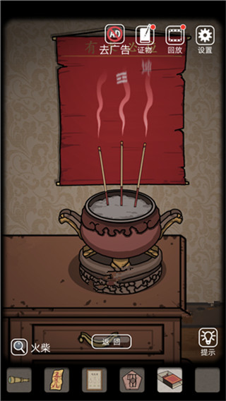 10、接着玩家点击柜子上的的香炉,插上三根香,随后使用火柴点燃,可以获得线索风、坤